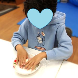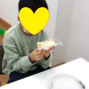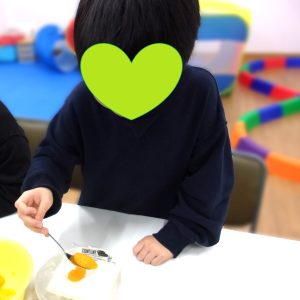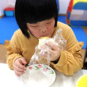 お皿にサンドイッチ用のパンを乗せてもらい、ホイップクリームをたっぷり塗って