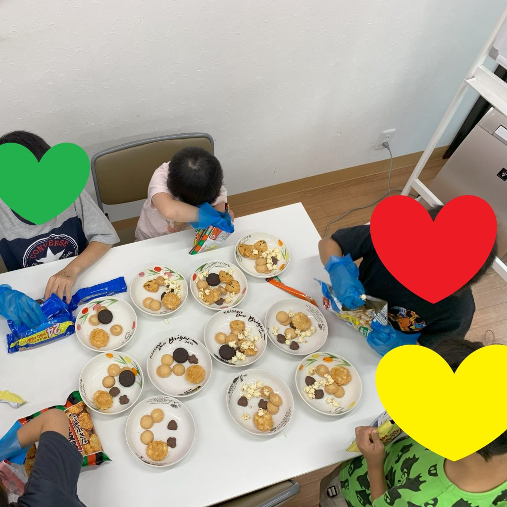 買ってきたお菓子をみんなに行き渡るように均等に分け分け。ジュースも同じ量になるように注いでね🥤