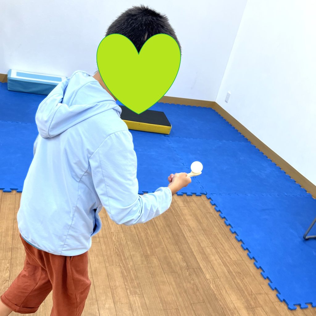 まずはスプーンにピンポン玉を乗せて、落とさないように器のところまで行きます。