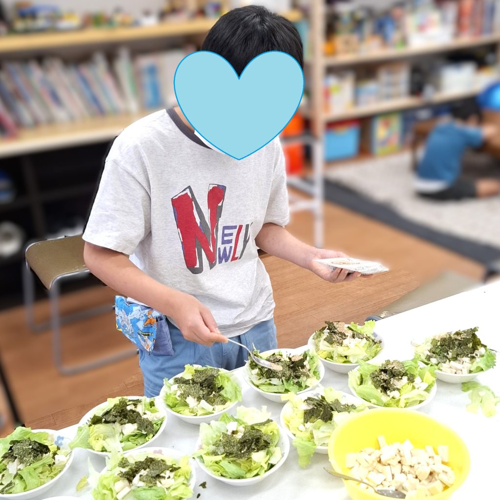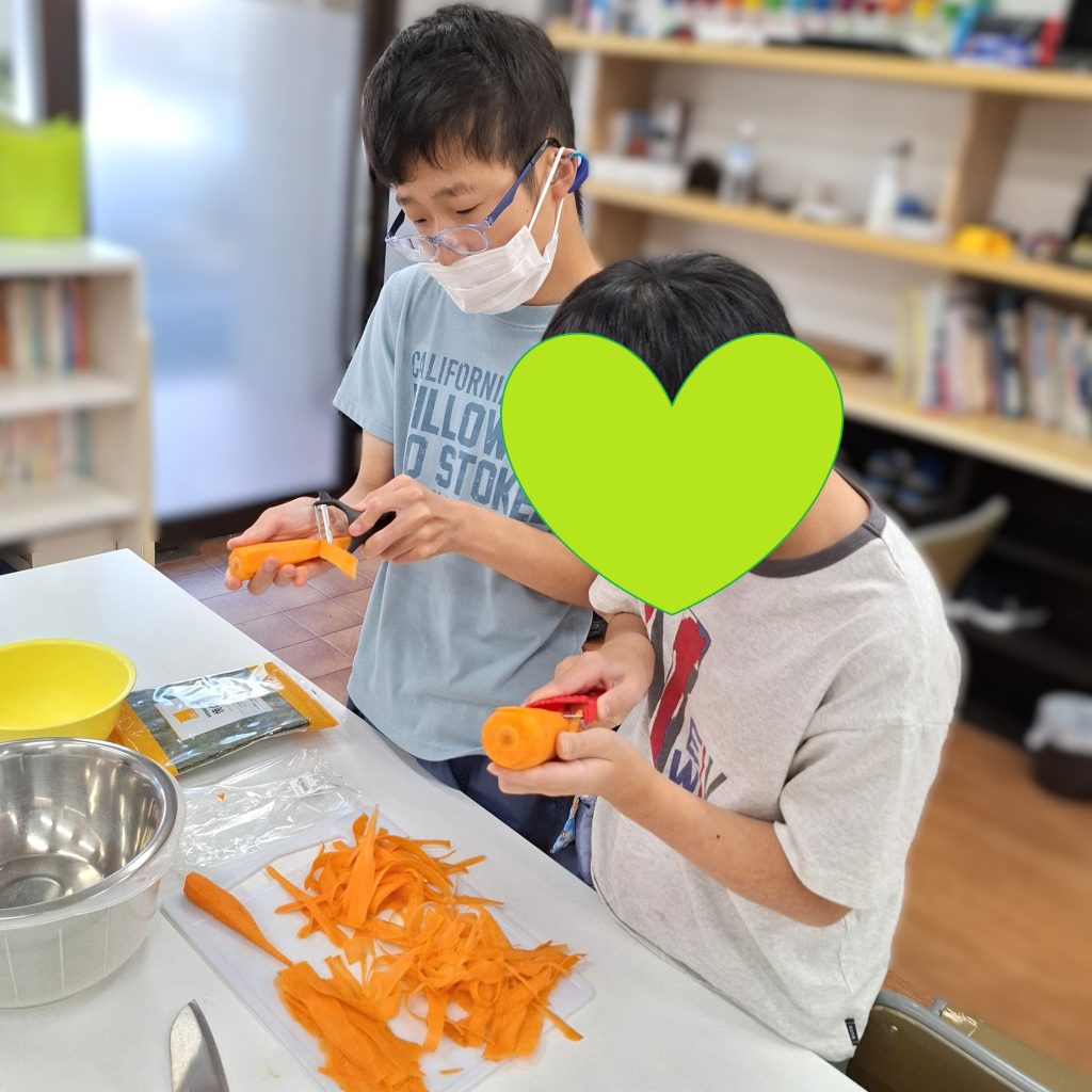 具材になるにんじんをピーラーを使ってスライスしたり、味付けやサラダの盛り付けなど、たくさん手伝ってくれました👍