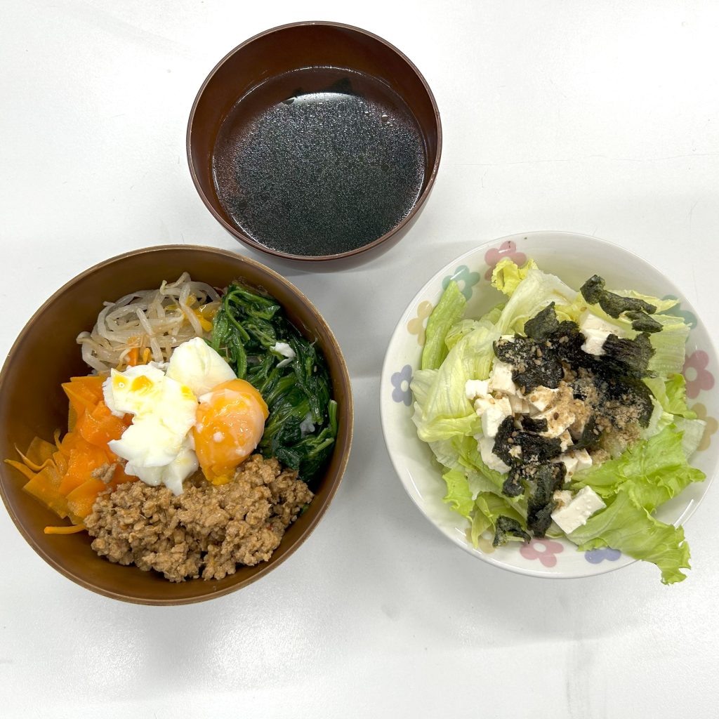 完成したビビンバやサラダ、スープはとってもおいしかったです😋