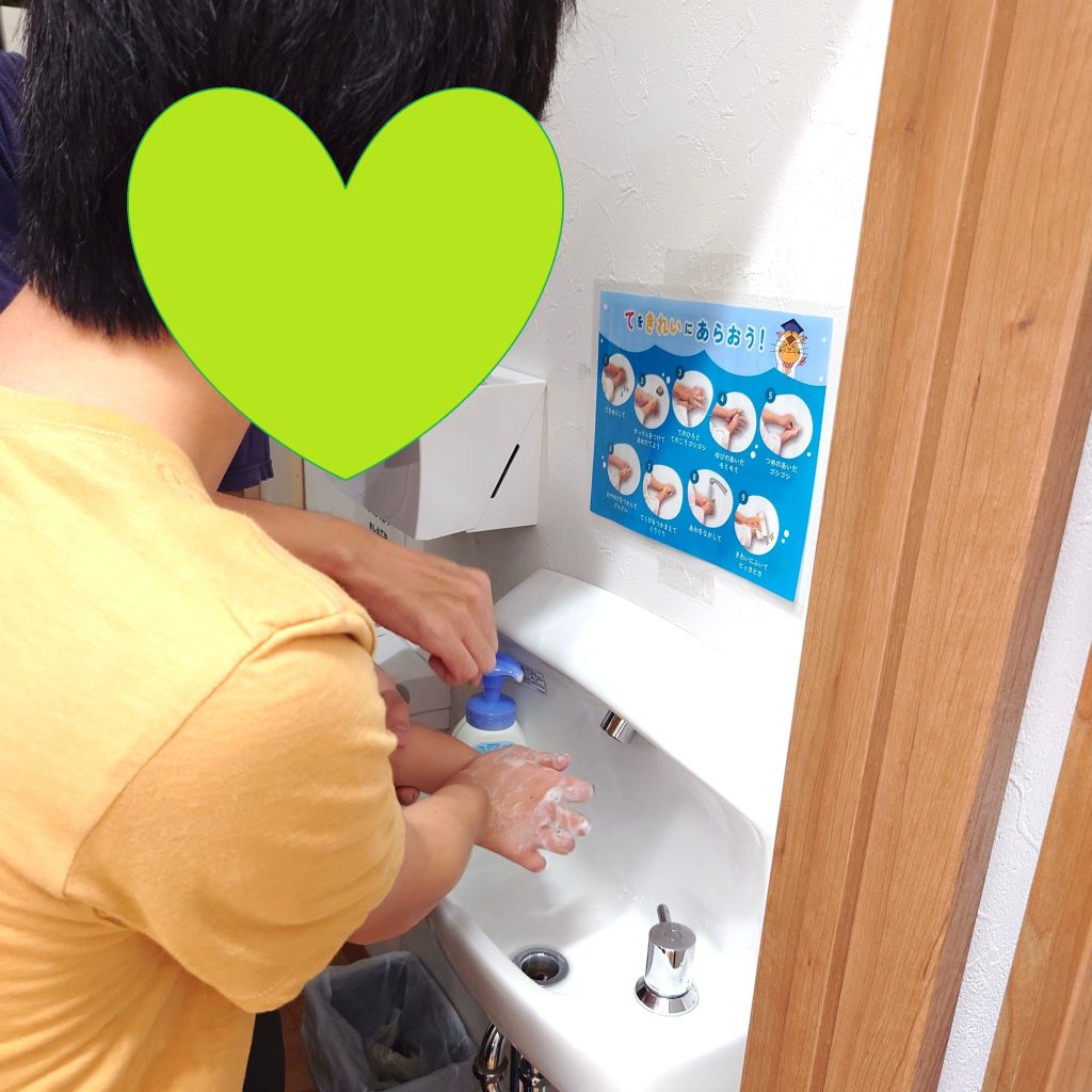 学校から帰ってきたお友達から、一人ずつ洗面台の前に張り出されている手洗いの手順通りに洗いました。