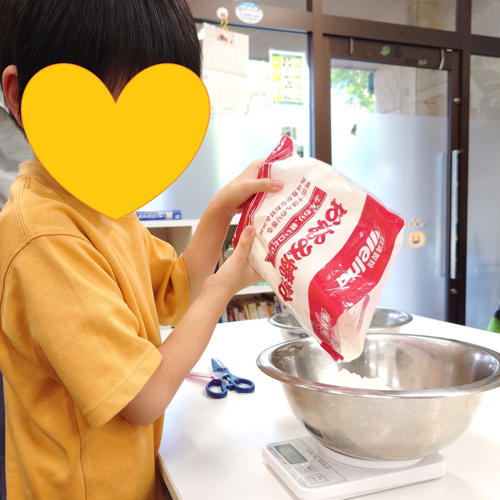 次にお好み焼き粉に水を入れてまぜまぜ🌀粉と水の量をきっちりはかって、ボウルからこぼれないように慎重に混ぜてくれました!