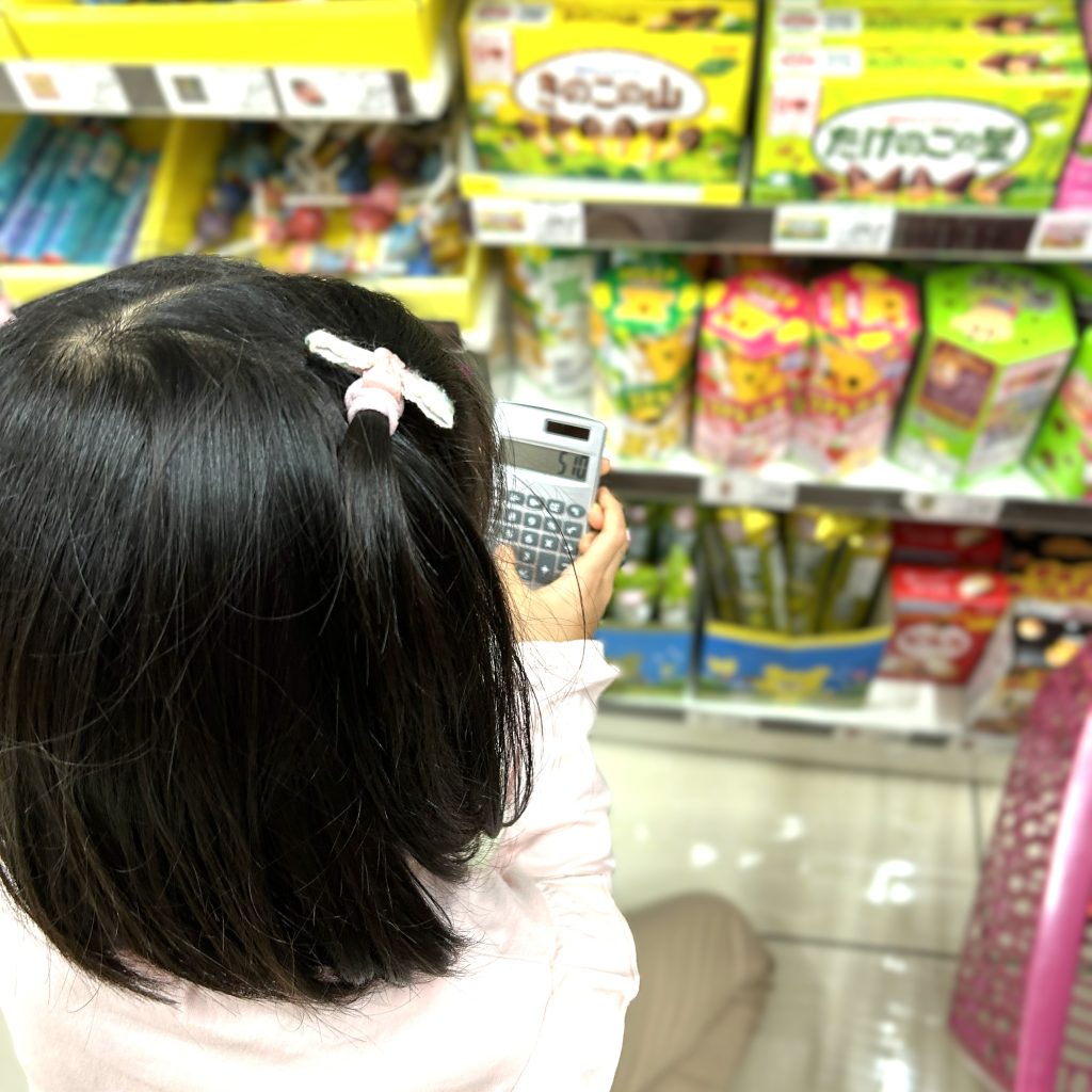 メモを見ながらお菓子を探し、予算を超えないように電卓で計算してくれました🤔