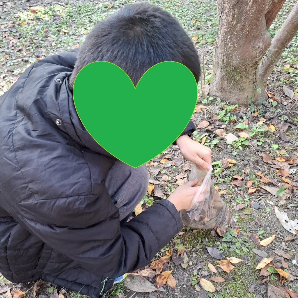 松ぼっくりを拾ったり、袋いっぱいに枯葉を詰め込んでいる子もいました☺
