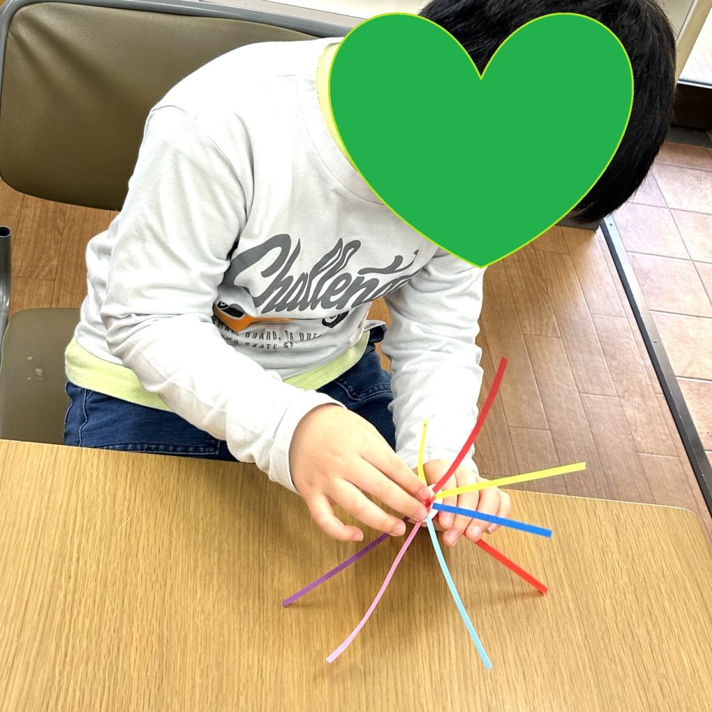 まずは丸シールの上に太陽のように様々な色画用紙の帯を貼ってもらいました!🌈