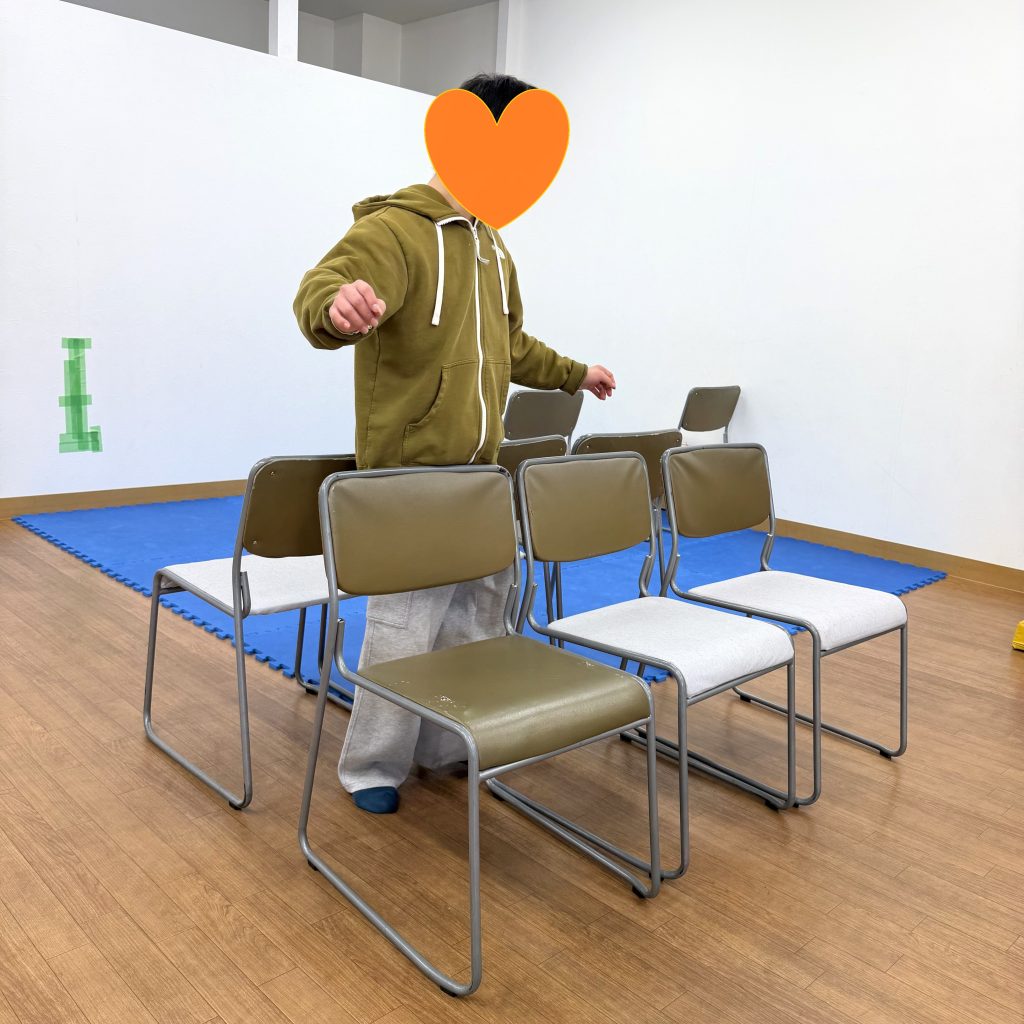 まずは椅子のすき間を通っていきます😃