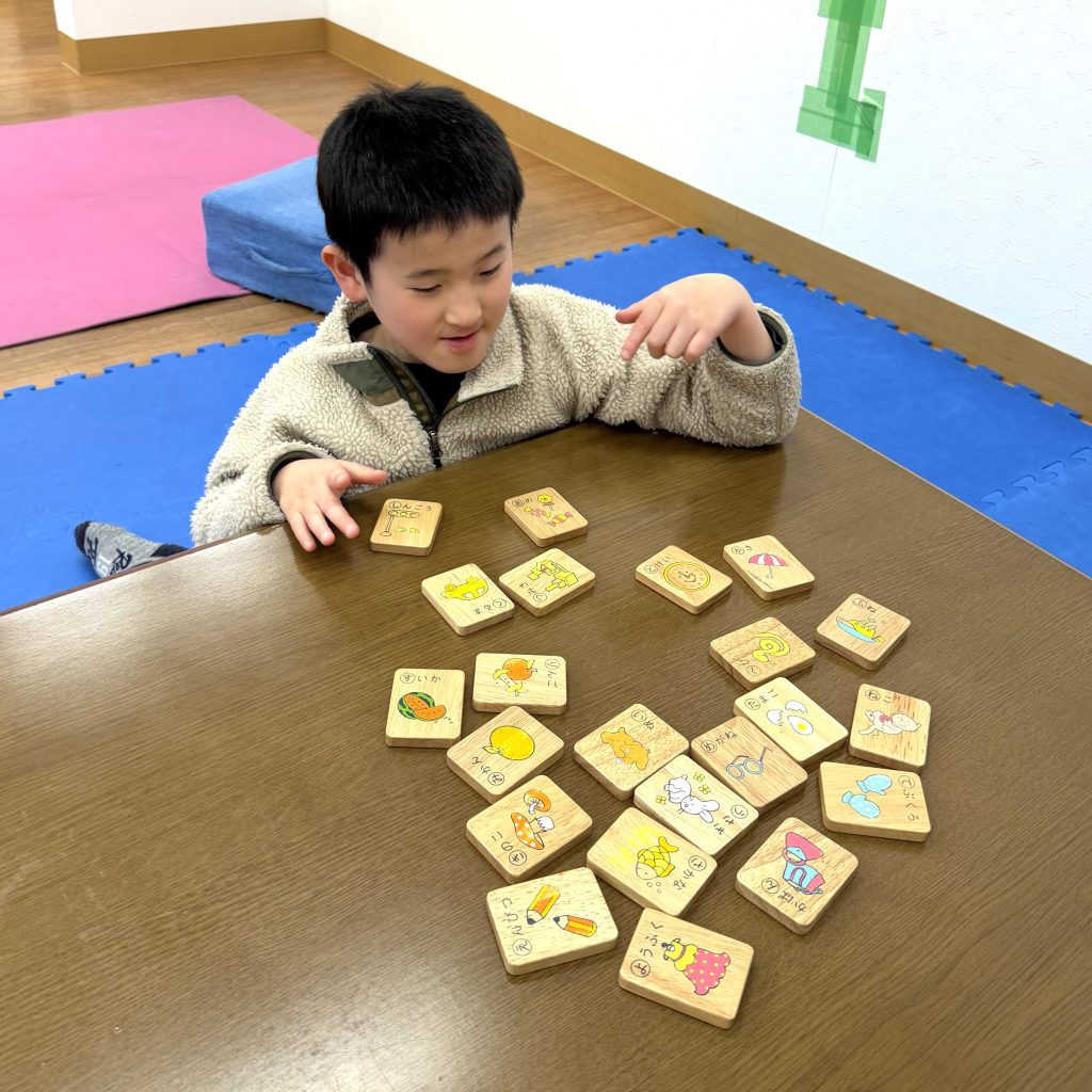 一つ目のチームは絵柄付きひらがな積み木を並べ、お題に合った絵柄を選ぶゲームをしました。